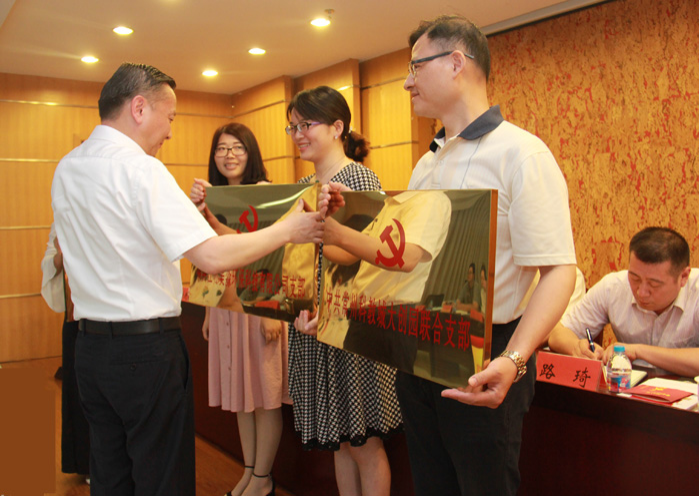 6月26日上午,在建黨96周年華誕即將到來之際,市委常委、宣傳部長、科教城黨工委書記徐光輝為江蘇美淼環(huán)保科技有限公司黨支部等三家新成立的黨支部授牌。